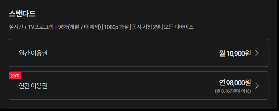 티빙의 콘텐츠를 제대로 즐기기 위해서는 스탠다드 이상의 이용권이 강요되는 것처럼 보여 아쉽지만,