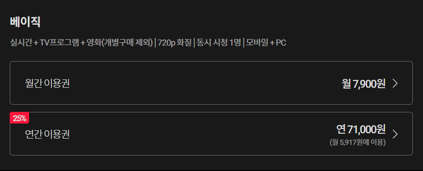 월간 이용권 : 7,900 연간 이용권 : 71,000 (25% 할인 적용) |
