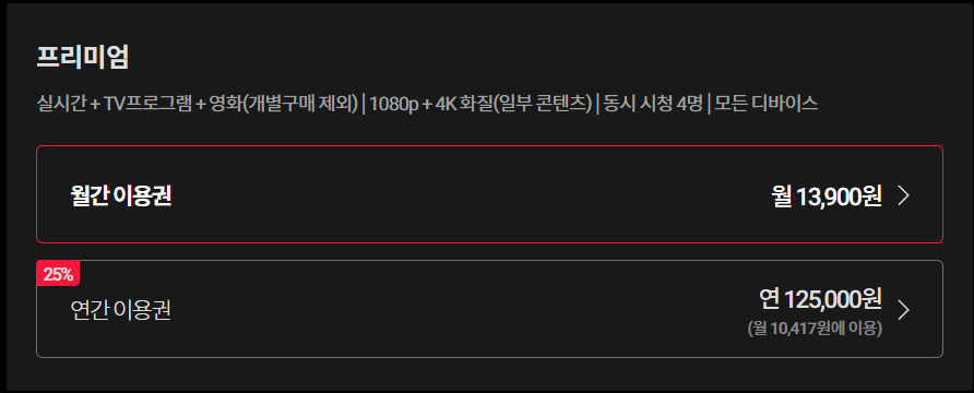 프리미엄의 경우 화질은 1080 + 4K로 시청이 가능하며 4명의 동시 시청 가능과 스마트 티비 사용이 가능합니다.