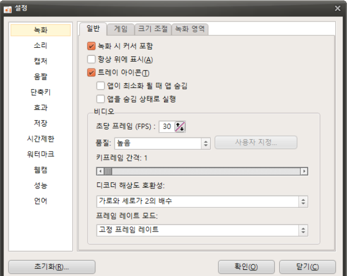 기록 영역: 캡처할 화면 영역을 설정할 수 있습니다.