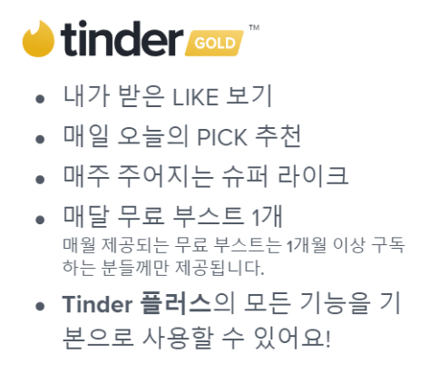 부스트 및 슈퍼 라이크: Tinder Gold 사용자는 월별 무료 부스트(프로필 가시성을 높이기 위해)와 추가 슈퍼 라이크를 받아 관심을 더욱 강하게 표현할 수 있습니다.