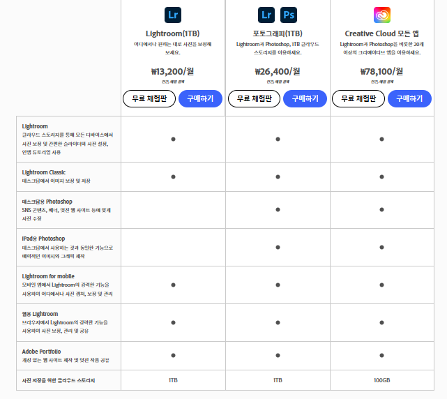 이 플랜은 사진가와 콘텐츠 크리에이터에게 필요한 도구들을 합리적인 가격에 제공합니다.
