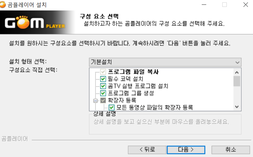 구성 요소를 선택할 수 있으며 곰 TV 프로그램 그룹 생성등 자신에게 필요 없는 항목의 경우,