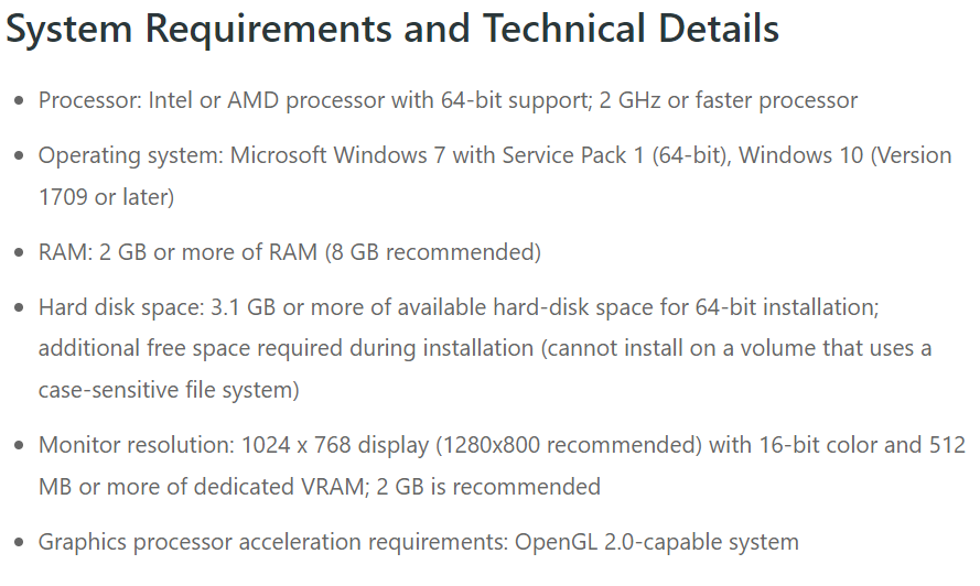 RAM은 적어도 2GB이지만 8GB를 권장합니다.