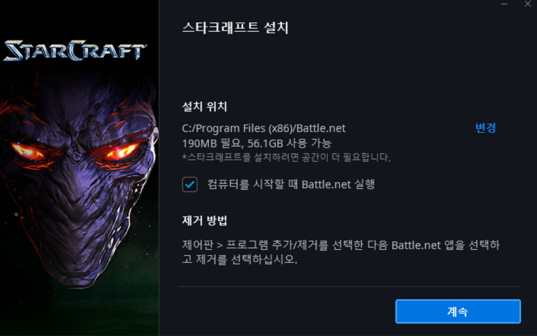 베틀넷을 설치하기 위해서 180MB의 용량이 필요하며 계속을 진행해 주세요.