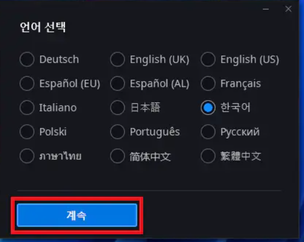 실행시킨 후 자신이 사용하고 싶은 언어를 한국어를 선택해 계속 진행하시기 바랍니다.
