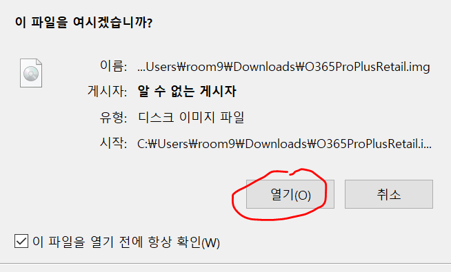 다음 이 파일을 여시겠습니까? 문구가 나오면서 팝업창이 뜨게 되는데,