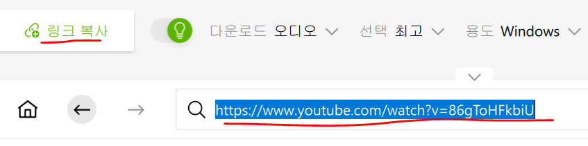 첫 화면으로 돌아가서 유튜브에서 검색을 하면 링크 복사라는 상단 도구를 사용할 수 있습니다.