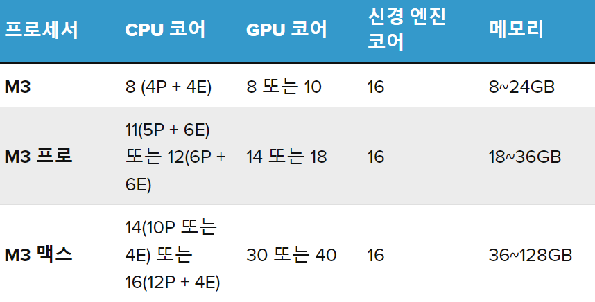 위 사진은 m3 칩 종류별로 스펙을 비교한 것입니다.