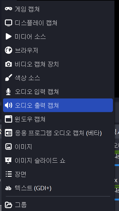 소스 추가: "소스" 패널에서 우측 상단에 있는 + (더하기) 아이콘을 클릭하면 다양한 소스 추가 옵션들이 나타납니다.