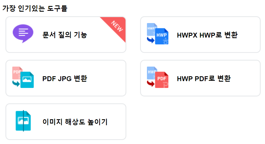 가장 인기 있는 도구들에는 HWPX HWP로 변환, PDF JPG 변환, HWP PDF 변환, 이미지 해상도 높이기 등이 있습니다.