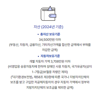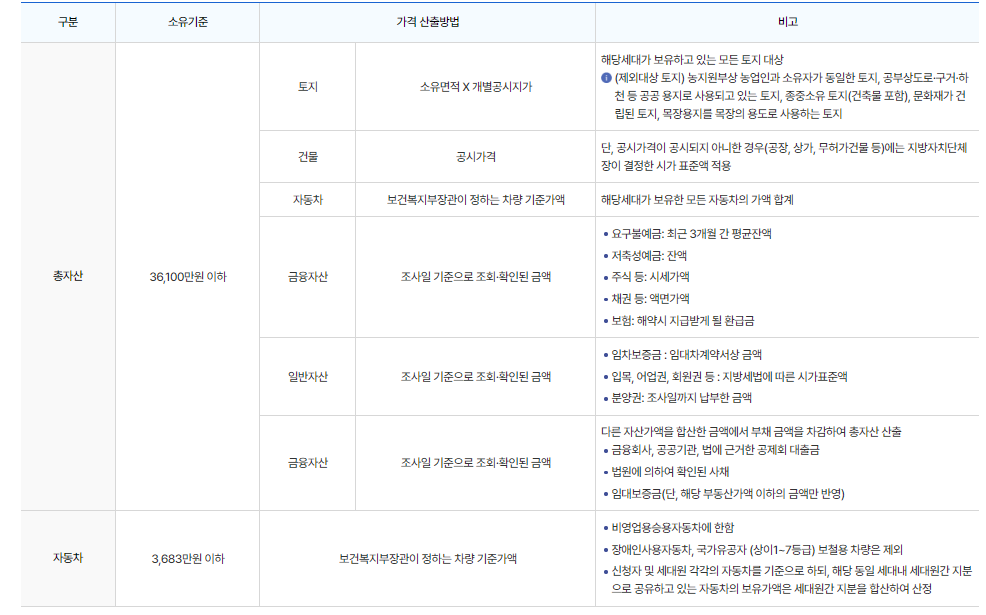 총 자산 보유기준: 36,100만원 이하 자동차 보유기준