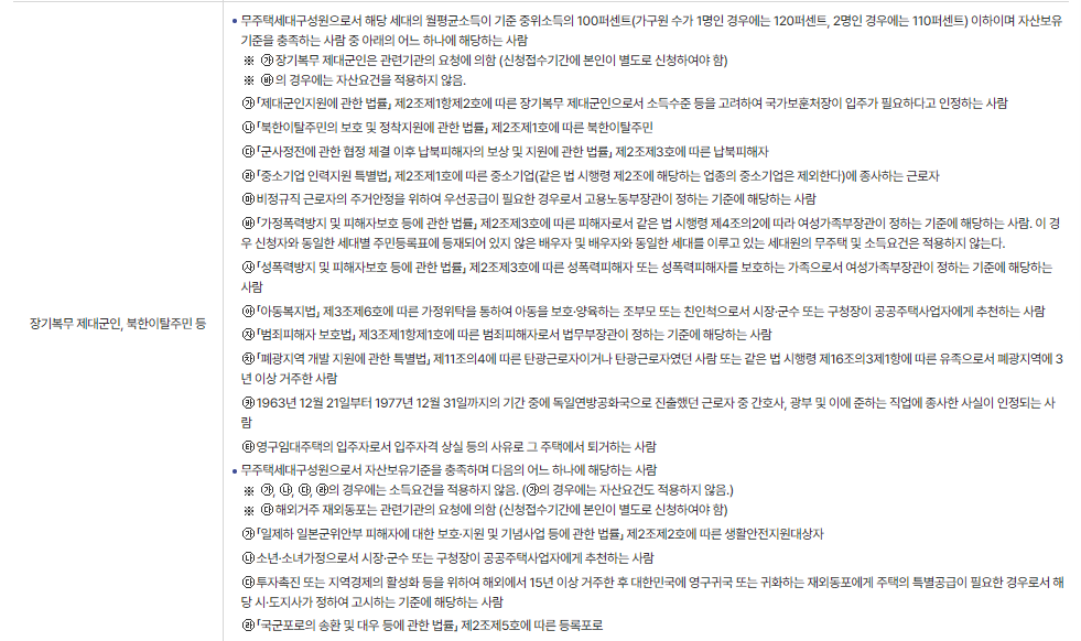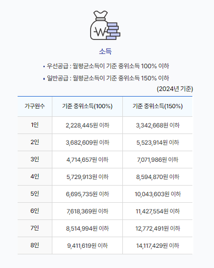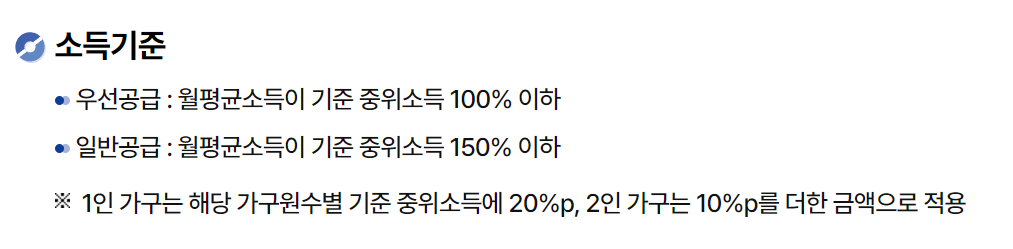 우선공급: 월평균소득이 기준 중위소득 100% 이하 일반공급: 월평균소득이 기준 중위소득 150% 이하 자산