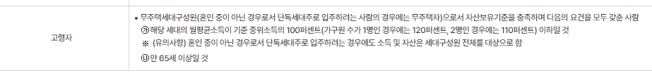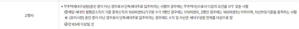 무주택세대구성원 중 다음의 요건을 모두 충족하는 사람 해당 세대의 월평균소득이 기준 중위소득의 150% 이하 만 65세 이상인 사람