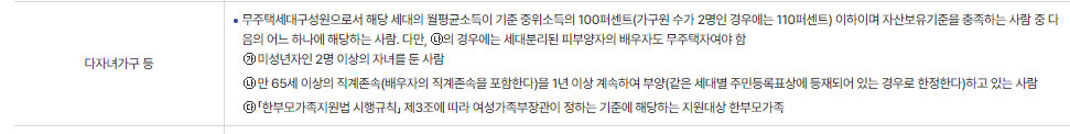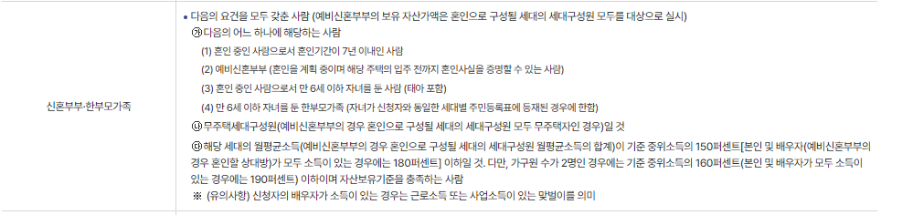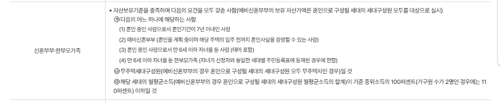 혼인 중인 경우 혼인 기간이 7년 이내이거나 예비신혼부부인 경우 만 6세 이하 자녀를 둔 사람 또는 한부모가족 특이사항: