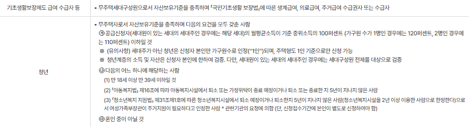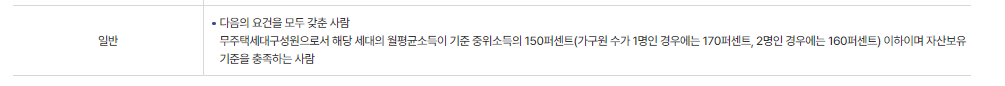 무주택세대구성원 중 다음의 요건을 모두 충족하는 사람 해당 세대의 월평균소득이 기준 중위소득의 150% 이하 특이사항: