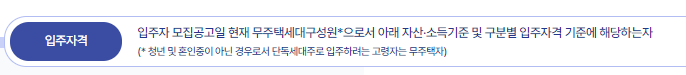 무주택세대구성원으로서 아래 자산·소득기준 및 구분별 입주자격 기준에 해당하는 자가 입주할 수 있습니다. 청년 및 혼인 중이 아닌 경우로서 단독세대주로 입주하려는 고령자는 무주택자로 간주됩니다.