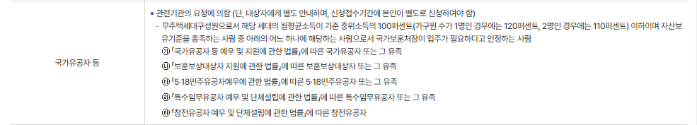 소득기준 및 자산보유기준 충족 및 관련기관의 요청에 따라 별도 신청 필요 소득기준 미적용