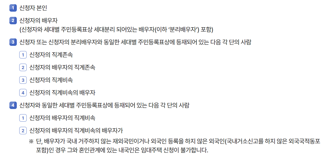 국내 거주하지 않는 재외국민이나 외국인 등록을 하지 않은 외국인과의 혼인 관계에 있는 경우 임대주택 신청이 불가능합니다.