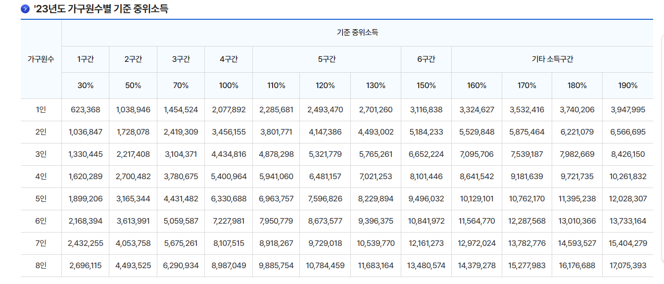 가구원수 | 기준 중위소득(100%) | 기준 중위소득(150%) |