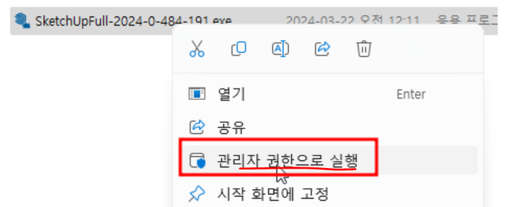 설치 파일을 오른쪽 클릭하고 관리자 권한으로 실행을 선택합니다.