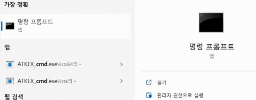 명령 프롬프트를 마우스 오른쪽 클릭하여 관리자 권한으로 실행합니다.
