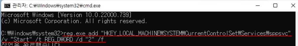 reg.exe add "HKLM\SYSTEM\CurrentControlSet\Services\sppsvc" /v "Start" /t REG_DWORD /d "2" /f